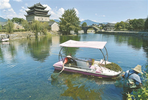 9月26日,江永县千年古村——上甘棠景区步瀛桥河段,保洁员在清理垃圾。连日来,该景区开展安全巡查、河道清理、食品安全检查、治安巡逻等行动,为迎接国庆黄金周做好充分准备。 潘百旺 摄