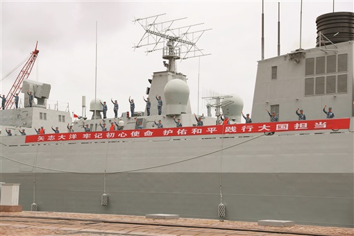 9月26日,中国海军第39批护航编队从山东青岛某军港解缆起航,奔赴亚丁湾执行护航任务。图为官兵在甲板上挥手告别。新华社发