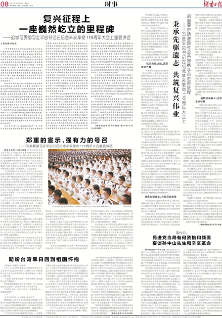 黄智贤说,习近平总书记的讲话,深刻揭示了中国共产党是如何继承孙中山先生的理念,践行先生遗志,完成他对中国的擘画和理想。“辛亥革命是思想的解放,也是往前的开创,是追求国家统一富强,更是让全体人民幸福。中国共产党当下就是这样做的。”