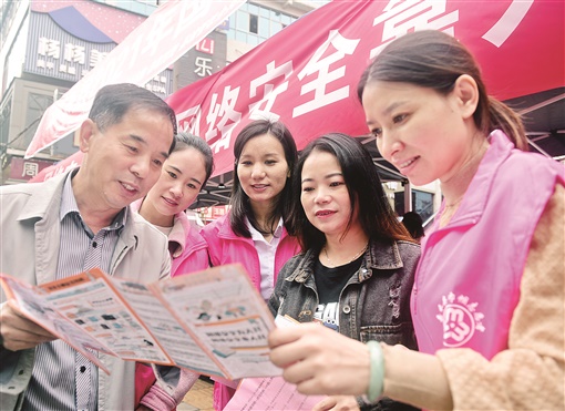 10月11日,嘉禾县珠泉镇晋屏社区,工作人员向居民宣传网络安全知识。当天,该县网信办联合公安、妇联、融媒体中心等部门开展“网络安全宣传进社区”活动,向居民普及网络安全知识,营造安全健康文明的网络环境。