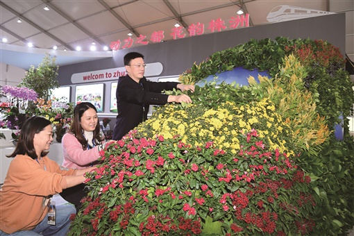 10月13日,长沙市雨花区石燕湖景区省花卉苗木博览会室内展馆,工作人员对展位细节和展品布设进行最后的调整。