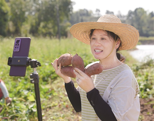 经过反复试验摸索,2020年,刘花香引进的“西瓜红”味道香甜,产量比2019年翻了一番。今年,刘花香在自家红薯地直播带货。“接单发货,搞手脚不赢!”她乐呵呵地说。