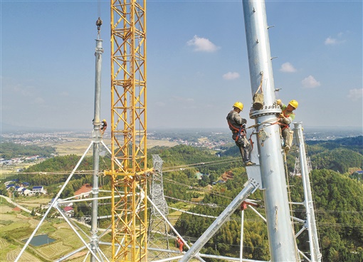 10月23日,位于长沙县的南昌至长沙1000千伏特高压交流线路工程6151塔位,施工人员使用落地双平臂抱杆进行铁塔组立施工。该线路工程在湖南省境内新建铁塔444基,目前已完成399基,平均每20天就能组建好一基铁塔。这为该线路今年底投入运行打下了坚实基础。
