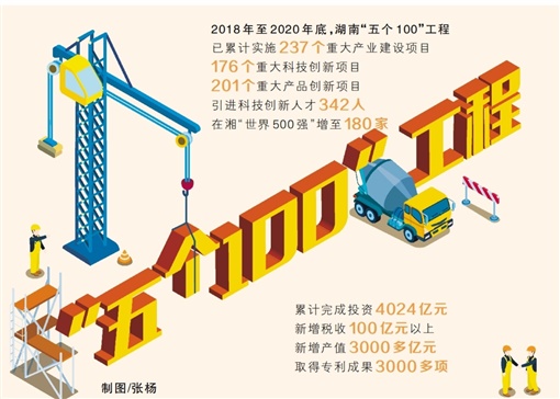 截至2020年底,全省“五个100”工程累计完成投资4024亿元、新增税收100亿元以上,累计实施237个重大产业建设项目,176个重大科技创新项目,201个重大产品创新项目,引进科技创新人才342人,在湘“世界500强”增至180家。