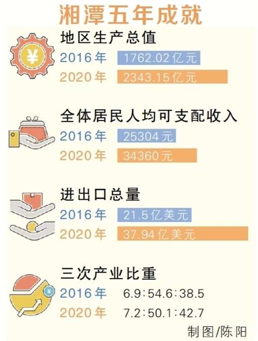 湘潭市以习近平新时代中国特色社会主义思想为指引,贯彻落实省委“三高四新”战略,将红色基因融入发展血脉,加快建设“大美湘潭”。2016年至2020年,全市地区生产总值、一般公共预算收入、固定资产投资、规模以上工业增加值年均分别增长7.1%、1.6%、11.5%、6.7%。