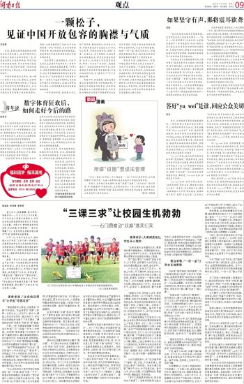 10月22日,走进石门四完小。伴随上午第二节下课铃声,该校近2600名师生从各班教室有秩序地正步跑入运动场、篮球场、足球场……精彩大课间开始了,先后有跑操、韵律操、喜剧操、礼仪操、自由运动五个环节。自由运动环节,足球穿飞、跳绳划弧、毽子起舞……