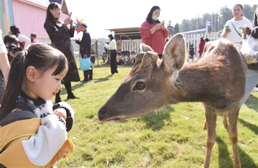 11月12日,游客与小鹿互动嬉戏。当天,长沙园林生态园鹿岛公园正式开园,首批9只经过驯化的小鹿与游客见面。