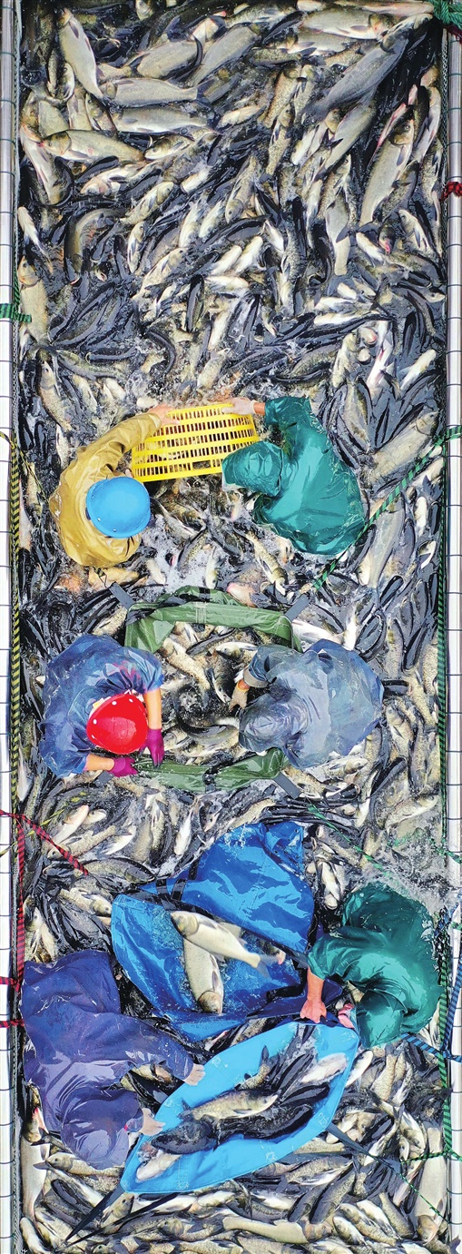 11月3日,岳阳县中洲乡中洲渔场,带领渔民忙着捞鱼的是杨和平的妹妹杨元满和妹夫刘金光。中洲渔场原来是请外面的捕捞队捕捞,如今,上岸渔民成立捕捞队,在家门口实现了转产就业。
