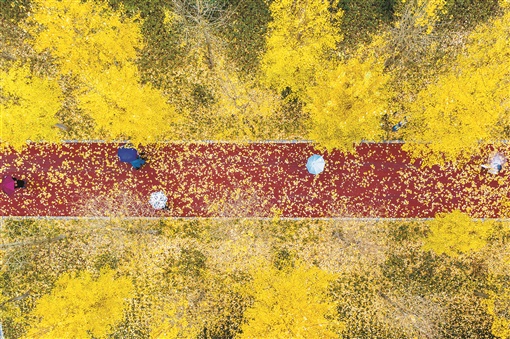 11月21日,游人在吉首市乾州街道一处银杏林参观游览。细雨蒙蒙,金黄色的银杏叶在雨中显得格外夺目,吸引游人前来观赏。 刘振军 摄