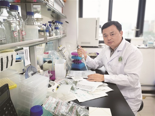 省直机关工委出席省第十二次党代会代表、杂交水稻国家重点实验室副主任吴俊从人工气候箱中取出了一盒稻瘟病菌培养皿,小心刮下菌落。他转身来到操作台,将菌落与表面活性剂混合,对水稻幼苗进行喷雾接种。接下来的几天,吴俊将密切查看叶片和菌斑的生长情况。