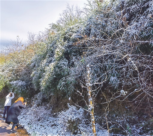 11月22日上午,浏阳市大围山国家森林公园,市民在拍摄雪景。当天凌晨两点左右,该森林公园迎来了今冬第一场雪。潘敏 摄