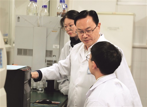 11月20日,周末,在湖南农业大学国家植物功能成分利用工程技术研究中心,省委教育工委出席省第十二次党代会代表、中国工程院院士、湖南农业大学教授刘仲华正在指导学生进行实验研究。