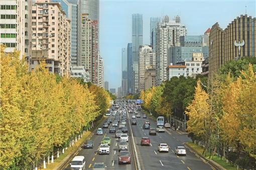 11月22日,暖阳照射下的长沙市芙蓉中路,两旁的银杏树金黄耀眼,车行其间,如同在金色画廊中穿行。 湖南日报全媒体记者 李健 摄