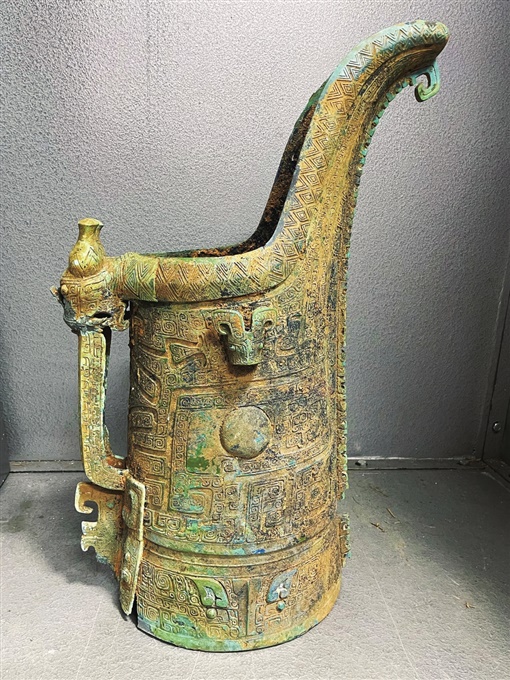 汨罗市文保中心主任赵磐说:“这件商周时期器物器型怪异,出土时还有一个兽面纹青铜贯耳壶倒置于器物腹内。我在文博岗位工作30多年,还是第一次见到这样的器型!”