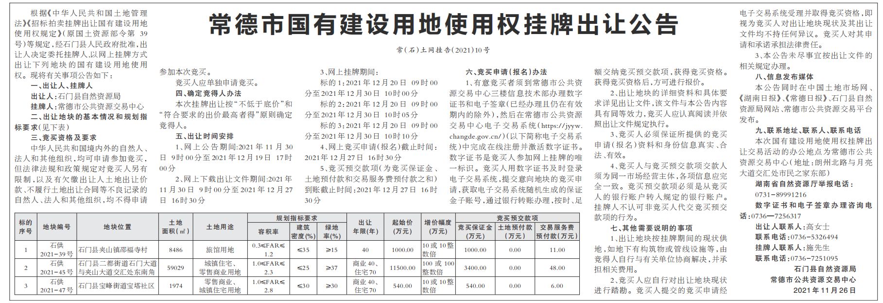 常德市国有建设用地使用权挂牌出让公告