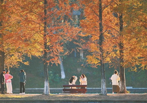 11月30日,湖南烈士公园年嘉湖畔的水杉林,在冬日暖阳的照耀下,色彩浓郁,美不胜收,吸引了众多市民前来参观留影。 湖南日报全媒体记者 童迪 摄
