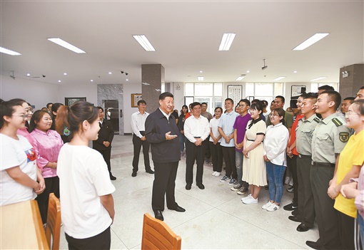 2019年7月16日上午,中共中央总书记、国家主席、中央军委主席习近平在内蒙古大学图书馆同学生们亲切交谈,勉励他们志存高远、脚踏实地、发奋图强。新华社发