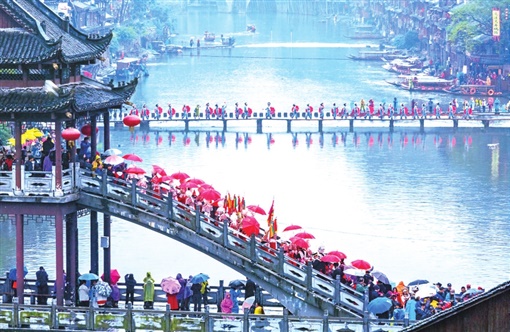 在促进文化旅游与乡村振兴深度融合上树立新标杆。凤凰大力推进景区标准化建设,将景区全部纳入国家A级标准建设管理,坚持全域建设加快实现更高层次“一业兴带动百业旺”。北线民俗风情游以山江镇为中心,西线兵战文化体验观光游以廖家桥镇为中心。此外,凤凰正在策划开通高铁旅游专列,拓展区域协作产品,以增加综合购物、休闲娱乐和夜间文化生活为重点,对游客进出古城和乡村游景点实行统一接驳,不断提升服务游客能力水平。