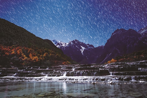 作为本年度最后一场大规模流星雨,北半球三大流星雨之一的双子座流星雨在12月14日迎来极大。图为12月13日夜间在云南省丽江市玉龙雪山脚下拍摄的星轨(堆栈照片)。
