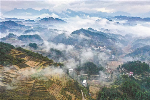 12月16日,绵绵冬雨中的龙山县民安街道大堰坪社区,白雾绕青山,宛若一幅水墨画卷。曾祥辉 摄