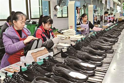 12月24日,洞口县工业园区兴雄鞋业有限公司,员工在生产鞋类产品。岁末临近,该县工业园区企业抓紧时间赶制订单产品,确保按期保质完成年度订单生产目标,力争实现生产“全年红”。滕治中 摄