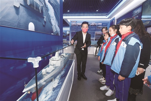 近现代海军装备主题展馆是中国船舶集团有限公司和湖南省政府合作共建的红色教育和国防教育基地。面积近500平米,分为室内、室外2个展区、6个篇章,以实物、图片、文字和模型的形式,介绍了鸦片战争以来的海军武器装备演变,重点展示了人民海军成立以来舰船装备从仿制到创新超越、从沿岸近海到走向深远海的代表成果。展览还引入了航母舰载机起飞降落虚拟体验、打海盗射击游戏、舰载机起飞指挥等多个体验互动类项目。
