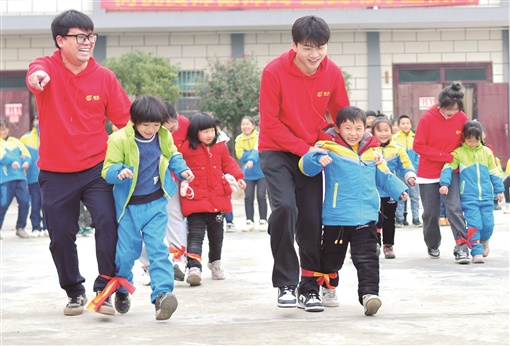 1月4日,双峰县井字镇花桥小学,爱心人士与孩子们一起做游戏。当天,湖南泰乐网络科技有限公司携手湖南馨心公益在该校开展“暖冬出发 让爱持续”爱心活动,向学校捐赠图书,为贫困学生捐赠助学金,让山村学生感受到社会关爱。
