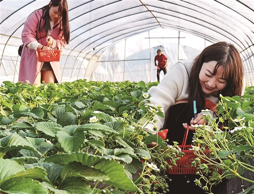 1月4日,宁远县文庙街道朝头坝村,游客在开心草莓园体验采摘乐趣。近年,该县调整农业产业结构,引导农民种植草莓、葡萄、火龙果等特色水果,发展现代休闲旅游采摘产业,推动农旅融合发展,带动农业增效,农民增收,促进乡村振兴。乐水旺 摄