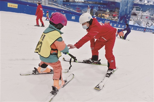 1月8日,少儿在滑雪场接受专业教练指导。当天,长沙湘江欢乐城欢乐雪域“酷雪少年滑雪训练营”正式开营,通过教授滑雪知识和技能,介绍冬奥会运动项目等,让青少年领略冰雪运动的乐趣。
