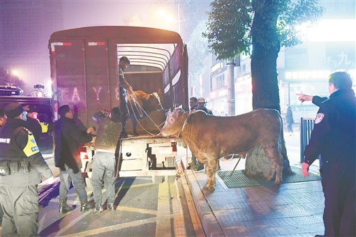 1月11日晚11时许,长沙市芙蓉中路湘雅医院路段,一头黄牛从货车上掉落到马路上,“悠闲”地在道路中间“散步”,迫使过往司机纷纷避让。长沙市公安局特巡警支队和湘雅路派出所民警及时出警处置,将黄牛送上货车,消除了一起道路交通安全隐患。湖南日报全媒体记者 辜鹏博 童迪 摄影报道