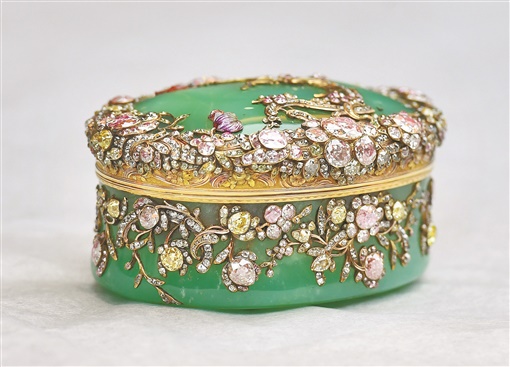 最后一个绿玉髓镶钻鼻烟盒是本次展览宣传海报上的文物。它是普鲁士国王腓特烈二世下旨设计制作的,主体绿玉髓是非常少见的玉石,周身镇嵌各色钻石,璀璨夺目。腓特烈二世因挚爱鼻烟盒而闻名天下,据传他收藏的鼻烟盒多达300余件。即使病重时,他也要把绿玉髓标本及各类珠宝、金盒置于眼前观赏。
