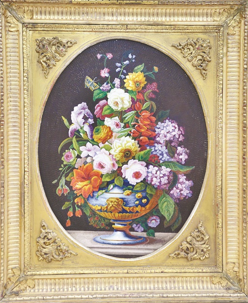 金色的边框中,黑底上是彩色的花卉。记者乍看上去,以为是油画,原来却是微型马赛克画作。