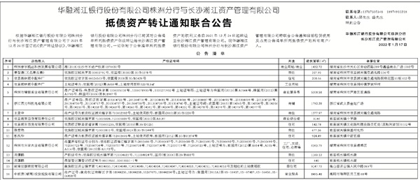 华融湘江银行股份有限公司株洲分行与长沙湘江资产管理有限公司 抵债资产转让通知联合公告