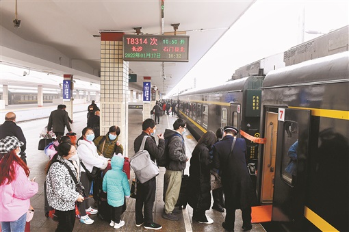 1月17日上午,长沙火车站站台,旅客正有序乘车。当天是2022年春运第一天。