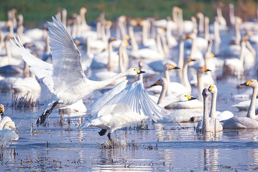 成群结队的天鹅或水中游弋或展翅而飞。 南洞庭湖国际重要湿地:风韵鱼乡,万物共生 在这个纯净、丰腴的鱼米之乡,什么风光最动人? 3对濒危物种红色名录的极危鸟类青头潜鸭在南洞庭湖筑巢、繁殖后代;在南洞庭湖消失近30年的国家一级保护动物“微笑天使”长江江豚再现南洞庭湖;往年在洪水季节才能看到的麋鹿,如今在退水季节也能常见于南洞庭湖湿地。 近年来,益阳市坚持重拳出击、铁腕治污,扎实推进洞庭湖生态环境专项整治,着力解决“两网两围”、非法采砂等突出问题,修复湿地30余万亩,清退保护区欧美黑杨21.14万亩,还河湖以碧波万顷,自然环境得到很大改善,珍稀鸟类、稀有水生动物等纷纷现身南洞庭湖。 |