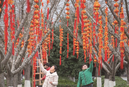 1月18日,道县月岩西路中间绿化带,工作人员在悬挂新春喜庆饰品。春节临近,当地广场、公园和街道以喜气洋洋的红灯笼、中国结、福字等新春饰品作点缀,营造出浓浓的年味。蒋克青 摄