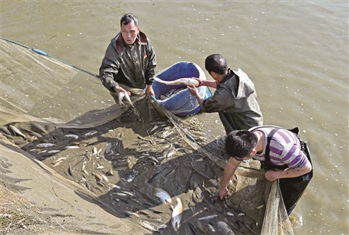 上图:1月20日,洞口县高沙镇社山村,村民在水塘捕鱼。春节临近,市场对水产品需求量逐渐增大,该县水产养殖户抓住机遇,捕捞鲜鱼供应年节市场。滕治中 摄