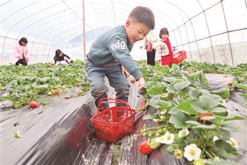 1月21日,新田县中山街道潭田村,游客在草莓基地大棚里采摘草莓。近年,该村利用城郊地理位置优势,引导农民大力发展特色精品蔬菜水果种植,推进休闲农业和乡村旅游融合发展,助力乡村振兴。刘贵雄 摄
