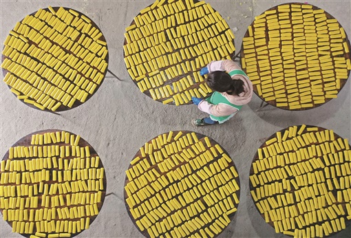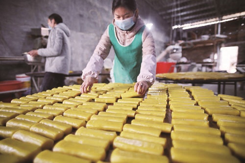 1月23日,江华瑶族自治县沱江镇老县村年糕作坊,村民在制作黄年糕。黄年糕以香米、糯米为原料,用黄栀子水染色,经过泡米、打粉、上色、揉捻、出糕等工序制作而成,是瑶乡人春节的必备美食。