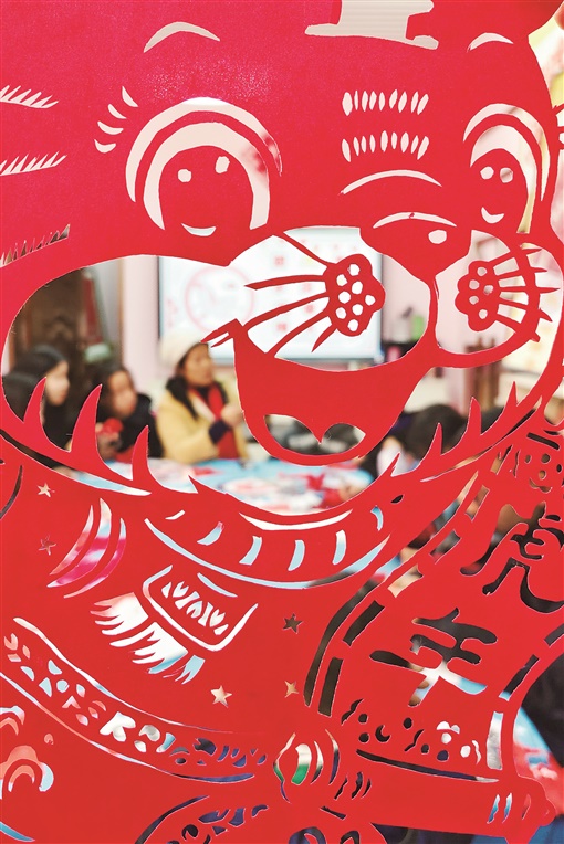 1月23日,老师在指导小朋友剪纸。当天,衡东县洣水镇某非遗剪纸馆,小朋友们创作带有“虎”元素的剪纸作品,喜迎虎年到来。肖亚辉 摄