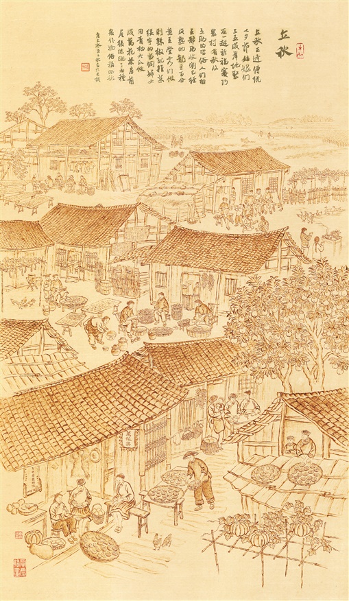 两人在《湖湘二十四节气图》中,不仅描绘种树、插秧、莳田、收麦、割稻、采橘等不同节气期间的生产劳动场面,还穿插祭拜“秧田神”、安仁赶分社、赛龙舟、“晒秋”、耍龙灯、踩高跷、扎故事等丰富多彩的民俗活动。湖湘地区的一些非遗项目,如湘绣、益阳小郁竹艺、隆回花瑶挑花、滩头年画、滩头手工抄纸、制作安化黑茶等也得到体现,还有汉、瑶、苗、侗等各民族的特色建筑,包括“国保”文物单位邵东市荫家堂等。