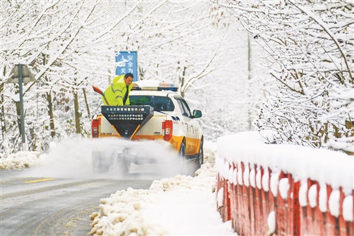 2月7日,工作人员在国道G209龙山县茨岩塘镇石家垭路段进行撒布融雪剂作业。2月6日起,该县普降大雪,当地公路部门及时组织人员在高海拔地区公路进行融冰铲雪作业,确保道路畅通。