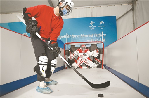 2月12日,北京海淀公园冬奥文化广场冰雪体验区,一名小朋友体验打冰球。