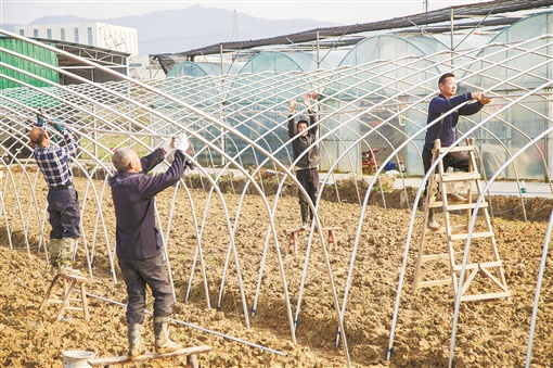 上图:2月24日,平江县伍市镇颜家村,寿光农机合作社社员正抓紧搭建育秧大棚。今年,该县计划播种面积101万亩,其中早稻种植计划面积33.05万亩。