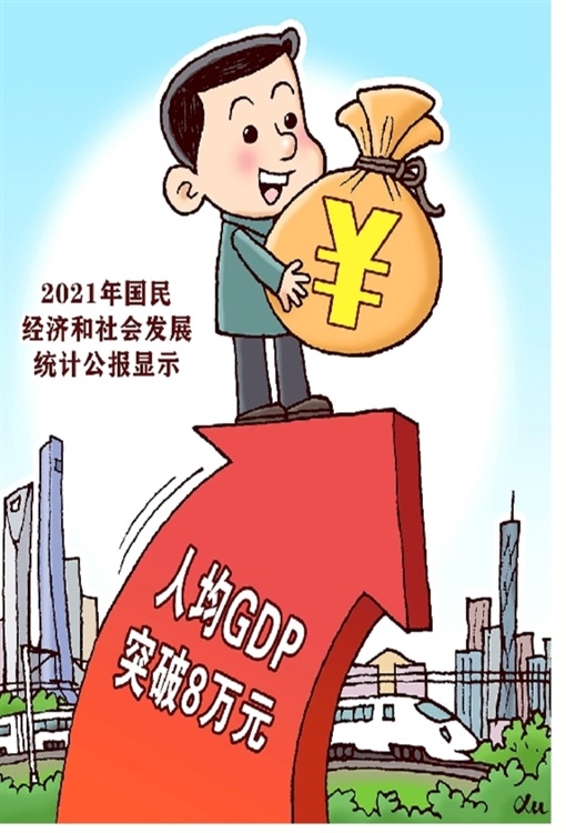 公报显示,2021年,我国GDP比上年增长8.1%,两年平均增长5.1%,在全球主要经济体中名列前茅;经济规模突破110万亿元,达到114.4万亿元,稳居全球第二大经济体。人均GDP突破8万元。