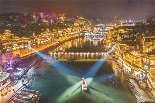 3月7日晚,凤凰古城华灯初上,古色古香的建筑在灯光的映衬下五彩斑斓,让游客沉醉其中,感受湘西魅力。湖南日报全媒体记者 李健 摄