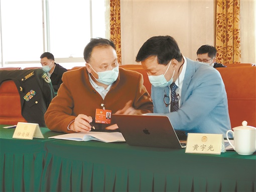 3月6日,住湘全国政协委员徐自强(前左)在参加小组会议时,与其他委员围绕政府工作报告开展交流。作为一名来自基层的医卫界委员,今年全国两会,徐自强聚焦基层医疗服务发展,提交了《加强基层医疗机构基本药物管理》等提案。通讯员 摄