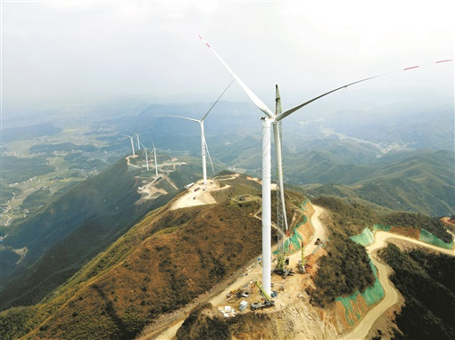 3月13日,湘潭县昌山生态风电场建设现场,工人在吊装叶轮。该风电场项目设计装机规模44MW,计划投资约4.15亿元。建成投产后,预计项目年上网发电量为9688万千瓦时,有助于改善当地能源结构,推动当地经济发展。李建新 摄