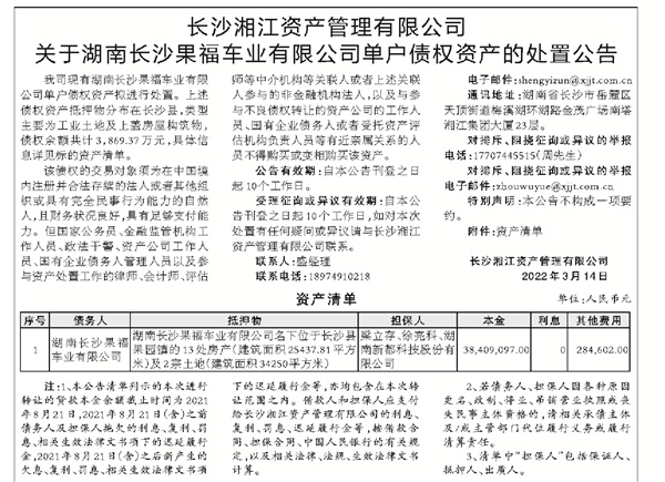 长沙湘江资产管理有限公司关于湖南长沙果福车业有限公司单户债权资产的处置公告