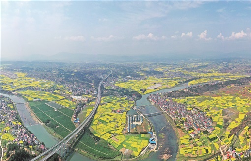 3月14日,溆浦县桥江镇,绚丽的油菜花海与村庄、远山、河流构成一幅美丽的乡村画卷。近日,随着气温回升,该县30余万亩油菜花进入盛花期。 湖南日报全媒体记者 李健 摄